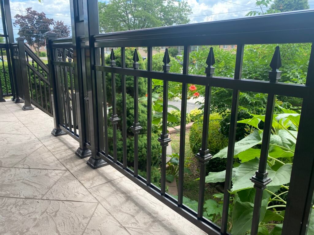 A wooden railing built with the deck is the most basic style you can add to your deck. Although it matches the deck by using the same material, it does not do you brand new deck justice. If the space is used for kids or a small side deck for a cottage and your main reason for a railing is simply for safety, then a wood railing will do just fine. Vinyl railing, although not as common as the other options, is a heavy bulky railing. All parts of vinyl railing are oversized. The post, pickets, and handrail are all large in comparison to other railing systems. It does give the appearance of old fashion, bulky wood railing if that is the appearance you are after. The most versatile type of railing is an aluminum railing. With the largest selection of design options and post and picket sizes, aluminum railing is the most versatile design idea for a new deck and backyard patio. Although very rare, iron railing is still an option for your new deck. Typically used on front porches, and interior staircases and walkways, iron railing offers a thinner profile but does give you options for your railing as they can weld pretty much any of your design ideas for your new deck guardrail. If you’re look for a high end, ultra-modern look then glass railing is most likely what your design idea would be. Glass railing offers many different options of glass tint and installation hardware. It will provide unobstructed views of your deck or patio as well as your backyard. And it can match or be contrasted with almost any home.